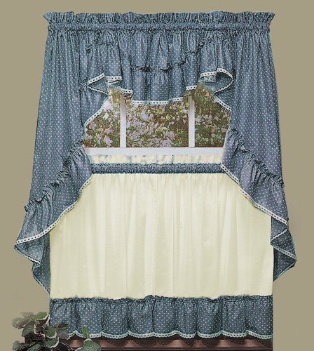 These country look window tiers feature traditional ruffles in a print fabric adorned with a decorative crochet look lace along the bottom edge of the ruffle The natural color fabric body matches the lace edging to complete the look Generously sized these curtains create an elegant fullness and multiple pairs can be used to accommodate wider window widths Add beauty to your windows with coordinating swags and valances Fabric content: 50% Polyester / 50% Cotton Machine washable 56" overall pair width x 24" long 56" overall pair width x 36" long 56" overall pair width x 45" long 56" overall swag width x 38" long 54" overall valance width x 14" long Quality made in the USA by Cambridge Curtains Click here for Measuring GuideDay-to-day inexpensive prices for Sturbridge Blue Ruffled Print Tier Curtain with items and also testimonials on Sturbridge Blue Ruffled Print Tier Curtain webstore.