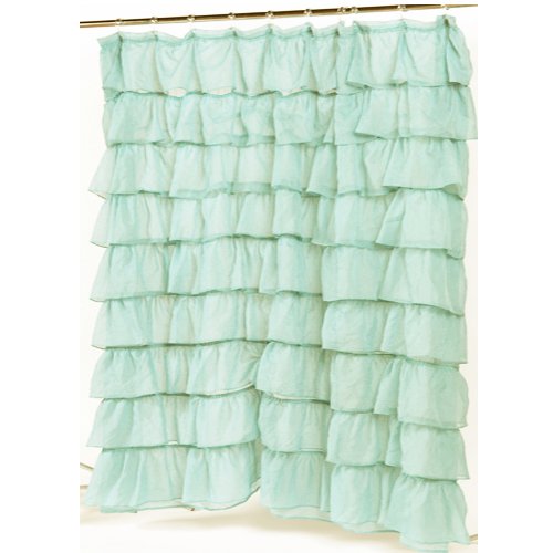 A delightful frilly sheer shower curtain Layers of deep ruffles cover this elegant shower curtain from top to bottom Use this beige shower curtain liner for a pristine effect Use a colored shower curtain liner to tint this sheer shower curtain to match any color you desire 100% polyester voile Machine wash and dry 70" w x 72" long Available in Beige, White and Spa Blue-Aqua